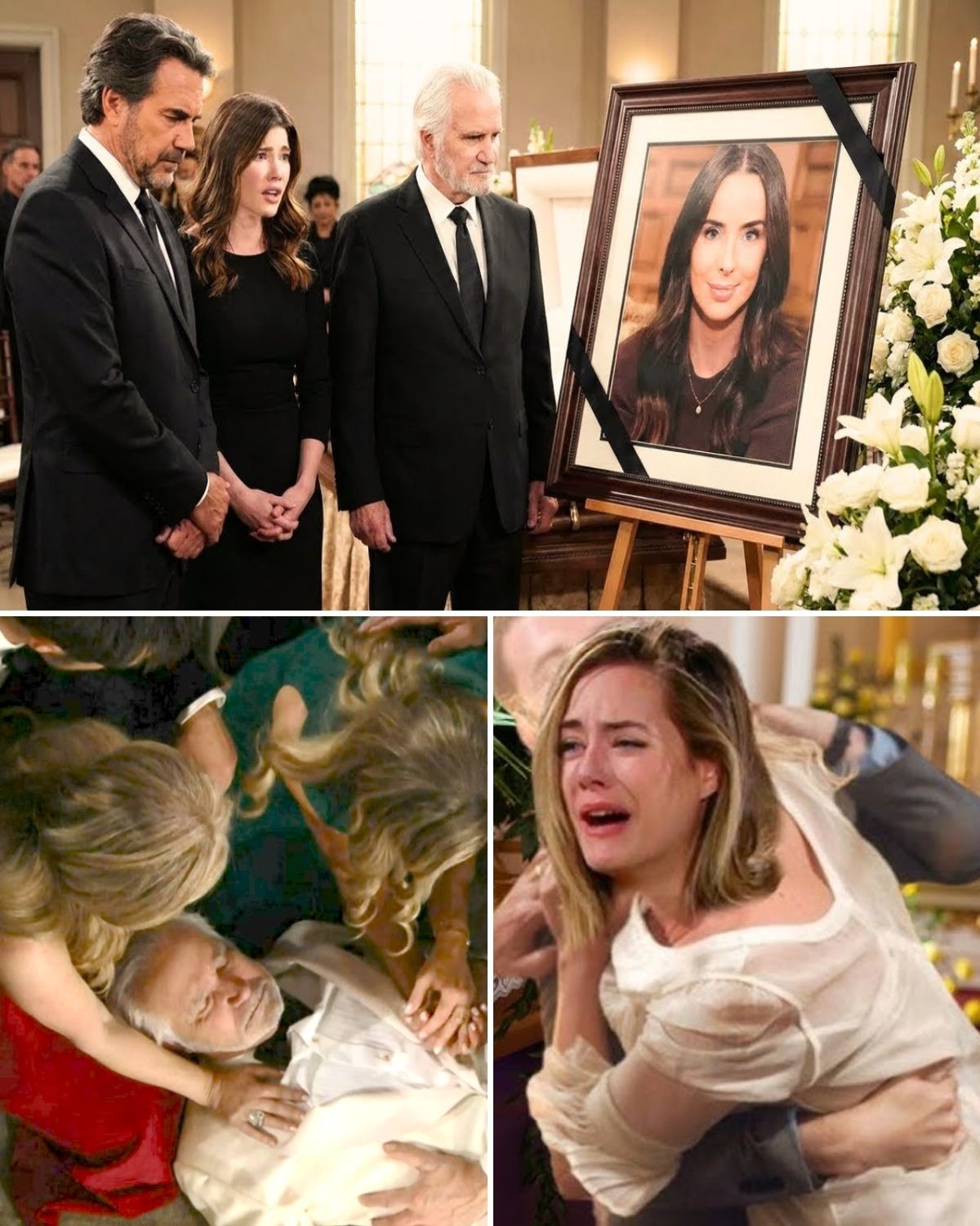 Inside the sterile hospital room, Brooke collapses, grief engulfing her as the cold truth sinks in. Ridge stands stoic, white-knuckled, while the younger Foresters huddle, fragile and lost. Among the sterile flowers sits a lipstick-stained glass and a photograph of Eric alive, smiling—a poignant symbol of what has been irretrievably lost.